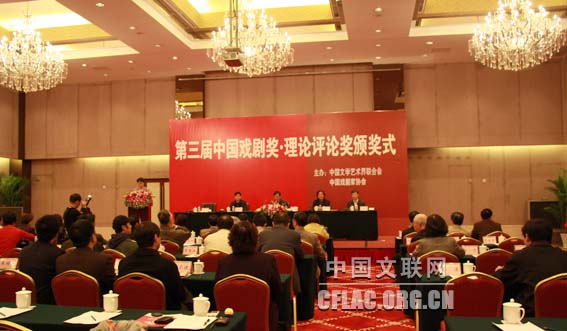 由中国文联、中国剧协主办的第三届中国戏剧奖·理论评论奖颁奖仪式暨“戏剧的品格和使命”研讨会10月20日至21日在北京举行。中国文联党组副书记、副主席李牧以及中国剧协分党组书记、驻会副主席季国平,中国文联理论研究室主任董耀鹏,中国剧协副主席、第三届中国戏剧奖·理论评论奖评委会主任王晓鹰,中国文联国内联络部副主任李培隽,中国剧协分党组成员、秘书长刘卫红以及本届评委会评委、获奖作者及戏剧界专家学者70余人参加了颁奖仪式和研讨会。季国平宣读获奖名单,王晓鹰介绍评奖情况,刘卫红主持颁奖仪式。