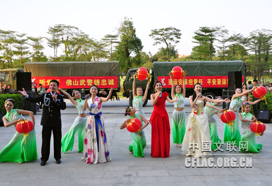 为确保亚运平安、顺利进行,10月下旬,武警部队官兵以威严的军容、饱满的士气,全面进驻与佛山赛区有关的所有场馆,为亚运保驾护航。作为佛山市文艺家“六走进”工程之一,市文联积极配合佛山赛区工作的开展,组织了这场送文艺进部队安保一线的活动。