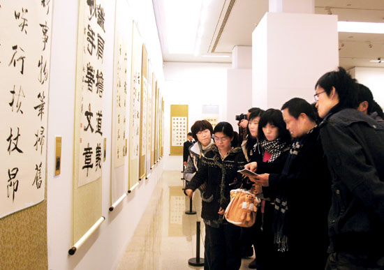 北京市文联成立60周年——书法·美术·摄影·民间艺术作品展11月18日在中国美术馆开幕。北京市政协副主席赵文芝以及金铁霖、朱明德、罗杨、林岫等有关方面领导出席开幕式。展览共展出4个艺术门类各60件作品,反映了北京这4个艺术门类的整体风貌。展览至28日结束。图为观众欣赏书法作品。中国艺术报记者 高 峰/摄影报道
