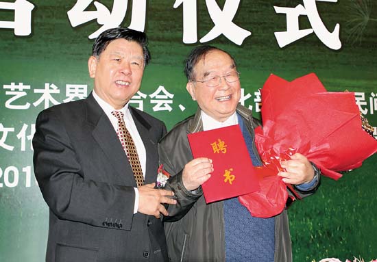 周巍峙、胡振民启动中国口头文学遗产数字化工程。胡振民为中国口头文学遗产数字化工程工作委员会名誉顾问周巍峙颁发聘书。