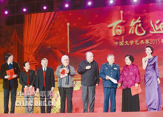 1月16日下午,北京人民大会堂大宴会厅张灯结彩,喜气洋洋,由中国文联主办的“百花迎春——中国文学艺术界2011春节大联欢”在这里隆重举行。图为王昆、阎肃、李默然、于洋、傅庚辰、韩美林、冯骥才等老艺术家发表新春感言。中国文联网 孟祥宁 彭宽 李亮 摄