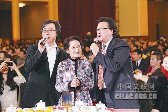 1月16日下午,北京人民大会堂大宴会厅张灯结彩,喜气洋洋,由中国文联主办的“百花迎春——中国文学艺术界2011春节大联欢”在这里隆重举行。图为张建一、廖昌永在恩师周小燕身边演唱《在这神圣的殿堂里》。中国文联网 孟祥宁 彭宽 李亮 摄