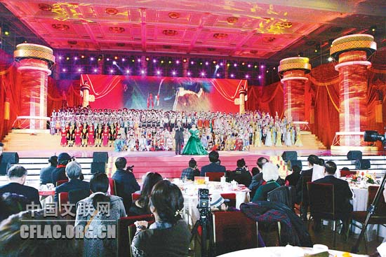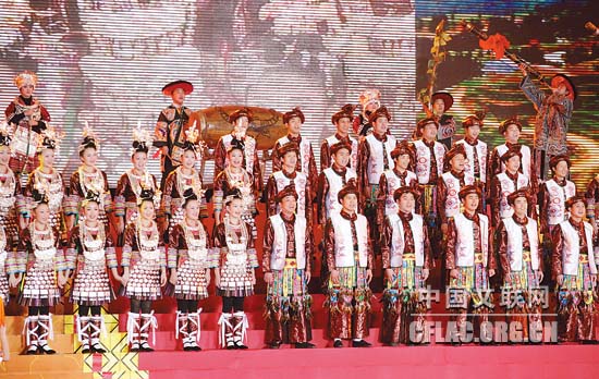1月16日下午,北京人民大会堂大宴会厅张灯结彩,喜气洋洋,由中国文联主办的“百花迎春——中国文学艺术界2011春节大联欢”在这里隆重举行。图为黔东南青年演唱侗歌《迎春花开红军来》。中国文联网 孟祥宁 彭宽 李亮 摄