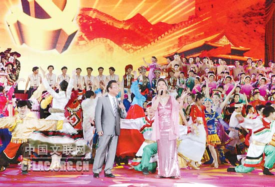 1月16日下午,北京人民大会堂大宴会厅张灯结彩,喜气洋洋,由中国文联主办的“百花迎春——中国文学艺术界2011春节大联欢”在这里隆重举行。图为载歌载舞的湖北民歌《龙船调》。中国文联网 孟祥宁 彭宽 李亮 摄