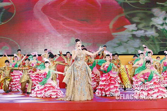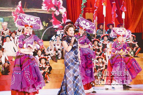 1月16日下午,北京人民大会堂大宴会厅张灯结彩,喜气洋洋,由中国文联主办的“百花迎春——中国文学艺术界2011春节大联欢”在这里隆重举行。图为张也精彩演绎《贵州恋歌》。中国文联网 孟祥宁 彭宽 李亮 摄