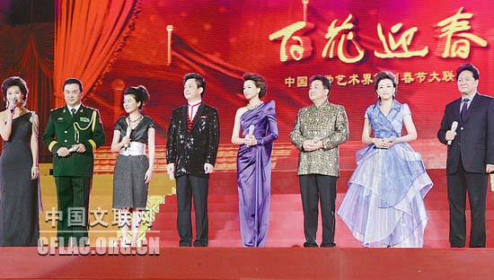 1月16日下午,北京人民大会堂大宴会厅张灯结彩,喜气洋洋,由中国文联主办的“百花迎春——中国文学艺术界2011春节大联欢”在这里隆重举行。图为强大的主持人阵容。中国文联网 孟祥宁 彭宽 李亮 摄
