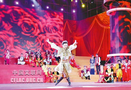 1月16日下午,北京人民大会堂大宴会厅张灯结彩,喜气洋洋,由中国文联主办的“百花迎春——中国文学艺术界2011春节大联欢”在这里隆重举行。图为精彩纷呈的新疆民族歌舞。中国文联网 孟祥宁 彭宽 李亮 摄 |