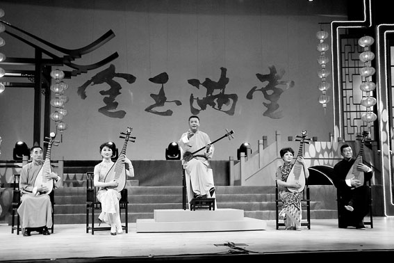 由江苏省曲协和苏州广播电视总台联合举办的《金玉满堂》2011春节江浙沪评弹大联欢近日在苏州举行。晚会汇集了来自江苏、上海、浙江的10多个院团的评弹名家和一线演员,包括“流光溢彩·传承篇”、“百花争艳·才艺篇”、“海纳百川·百花篇”、“光前裕后·经典篇”4个篇章共20个节目,现场气氛热烈。图为中篇评弹《芦苇青青》剧照。周明华/摄影报道