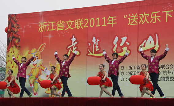 2月17日,由浙江省文联主办,浙江省曲艺家协会、余杭区文联承办的2011年“送欢乐下基层——走进径山”慰问演出活动在余杭区径山镇火热登场。小品《阿根的故事》、越剧清唱《十八相送》、绍兴莲花落《唱支山歌给党听》、滑稽独脚戏《滑稽越剧哈哈笑》、歌曲《好日子》、舞蹈《月映钱塘》、魔术《青春的旋律》、杂技《转碟咬花》纷纷上演,在元宵佳节为基层和农村群众送上了一道文化大餐。图为演出现场。