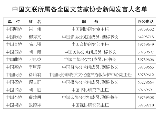 为落实中国文联八届七次全委会工作部署,推动中国文联所属各全国文艺家协会建立新闻发言人制度,近日,中国文联向社会各界公布所属各全国文艺家协会新闻发言人名单,以进一步宣传好文艺工作和文联工作。