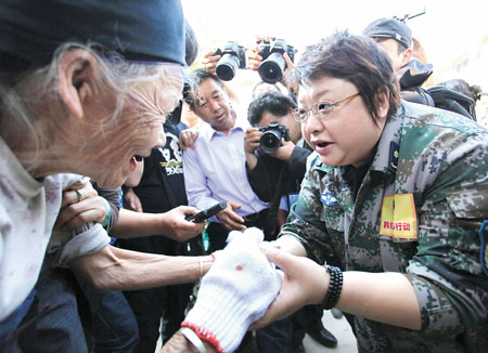 韩红等文艺界人士在盈江慰问受灾群众 何海燕/摄