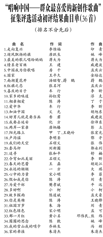 “唱响中国——群众最喜爱的新创作歌曲”征集评选活动通过为期半年、在全国范围内的广泛征集,日前遴选出36首入围歌曲进入终评。