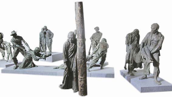众多惊异目光中的故事,似乎要从群雕中的首尾人物——孱弱的老妇和愤怒的男子说起。