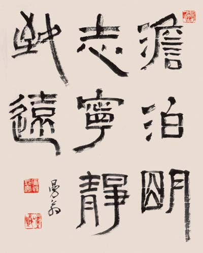 在数十年的艺术生涯中,沙曼翁先生除了学习领会传统经典书法和乃师萧退闇的宝贵经验之外,尤其在以下几个方面进行了大胆的探索、尝试和创新:用笔讲究笔意、笔趣的有机结合,取其自然,在“无意于佳”中流露出平淡简静的气息,在结构上主笔一丝不苟,而次笔往往意到便成,使其体势平中见奇;用墨润燥结合,浓淡适度,富于层次变化,有“干裂秋风、润含春雨”的强烈对比和节奏感;“骨”法用笔,线条多骨少肉,参含清挺秀逸的意趣,写小篆上溯金文,减少盘曲,“不向曲中寻,但往直中求”,笔势显得更加遒劲。