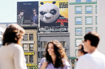 由美国梦工场电影公司拍摄,成龙、杨紫琼、刘玉玲、安吉莉娜·朱莉等著名电影演员配音的电影《功夫熊猫2》将于5月26日在美国上映。5月3日,在美国旧金山的联合广场,人们在《功夫熊猫2》广告牌前交谈。