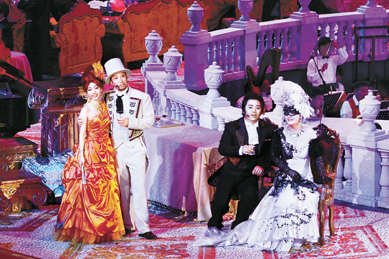 5月13日、14日,中央歌剧院在北京工人体育馆为近4000名观众上演约翰·施特劳斯的歌剧《蝙蝠》,剧中因醉驾入狱的艾森斯坦一句“没准能在里面见到高晓松呢”,引发全场爆笑。巨大的环形舞台搭在圆形赛场内,圆形的乐池则卧在舞台的中央,赛道般的舞台上错落摆放着沙发、桌椅、钢琴等简单的道具,舞台上方高高悬挂着由大渐小的三重“笼子”监狱,最小的“鸟笼”里放着玛丽莲·梦露软靠垫的仿制品。华丽的舞台、流畅的音乐、令人捧腹的剧情以及演员们精彩的表演,让不少第一次接触歌剧的观众感受到了歌剧艺术的魅力。图为演出剧照。