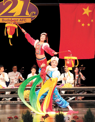 5月26日,布达佩斯21世纪国际艺术节中国之夜合唱音乐会在布达佩斯第10区文化中心举行。这场音乐会由中国音乐家协会、匈牙利音乐教师协会和匈牙利文化无国界基金会联合策划主办。图为在匈牙利首都布达佩斯,来自中国陕北府谷县的二人台艺术团表演二人台。
