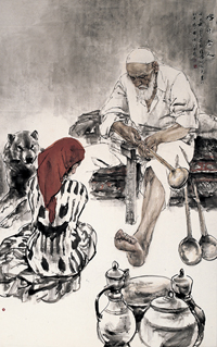 早在一千五百年前,谢赫在“六法”中提出了“气韵生动”这一理念。一个“动”字,体现了中国传统绘画与西方传统绘画的重要区别。众所周知,西方传统绘画以再现一个凝固的时空瞬间为己任,以科学的解剖与表现无限远的焦点透视规则相结合,力图在画面上还原一个真实的物理空间。杰出的现代主义大师如克利·康定斯基在现代主义探索中重视绘画语言的音乐性表现,但他们终究不能不为此而“背叛”他们传统的再现美学,并抛弃了当时东方人赞不绝口的科学解剖与透视。而中国传统绘画虽不写实,但更侧重于心理空间的描绘,强调意象的诗境表达。“气韵生动”之“动”,便有时间的参与,固中国传统绘画是空间与时间结合的四维表现。运动之美的产生在于节奏和韵律,因此,“韵”便是中国绘画语言中特有的诗化因素。“气运,就是宇宙中鼓动万物的‘气’的节奏、和谐。绘画有气韵,就能给欣赏者一种音乐感”(宗白华)。在中国传统绘画中,语言不仅负载着状物叙事的功能,而且通过节律性的表现成就了中国绘画特有的视觉音乐效应。“声乐之入人也深,其化人也速”(荀况)。因为音乐的节奏与韵律最容易引发受众产生异质同构的心理共鸣。“寻声律而定墨”,刘勰的美学思想,是中国传统文化中的表现性原则,几乎涵盖了所有文化门类,包括小贩的沿街叫卖和哭坟。古代的中国人将“乐”放在一个十分重要的位置,与治理社会的“礼”同等重要,古代文人的第一修养,便是琴,这种音乐修养加上他们原本谙熟的诗词文字韵律的功底,使他们最终在中国美术史上创造出最具音乐效应的绘画——文人画。在勾、皴、点、染的技法程式的框架中,以虚实为核心,形成了绘画语言要素的对偶组合格局。如构图的开合,形态的方圆、黑白,执笔的中(锋)偏(锋),运笔的顺(锋)逆(锋),行笔的疾缓,以及墨、色的浓淡、枯润等。这种对偶组合如同诗词中的平仄对偶,是便于实现语言节奏化的处理,使语言进入诗化的重要基础。中国绘画语言(包括划去)的音乐性或曰诗化,是中国绘画美学最鲜明的特征,也应当是当代继承传统的重要内容。当代的人物画经受了写实主义的洗礼,承受着科学造型与透视观念的制约,更多的是依赖西画的构图经验与造型的生动性来进行表现。这样,便使得绘画语言的叙事性排斥了语言的诗化表现。所以张鸿飞的艺术探索对我们应当具有启示性。