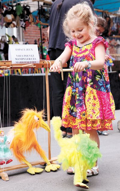 比利时第15届那慕尔民间艺术节6月1日至5日在那慕尔市举行,来自14个国家的53个艺术团体、300多位艺术家在街头、广场、花园、剧院和文化之家共66个演出地点表演700场节目,其中半数演出供人们免费观看。图为一名小女孩在比利时那慕尔街头摆弄提线木偶。