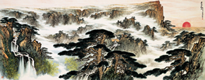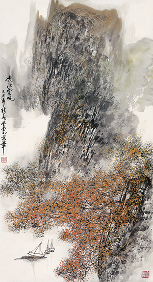 在分析和品评张登堂山水画时,必须指出其实写与虚写俱能、水墨与彩墨均佳的这一特点。他在实中求虚,注意虚实结合和虚实相生;他有时发挥黑白灰的交响,有时巧妙地处理墨与色的关系,使它们相互陪衬,相互辉映。当代中国山水画领域,大致上可分为两大派别,一派尊崇黄宾虹笔墨、以“游于艺”审美理念为旨意;另一派兼重丘壑与笔墨、以表现对客观自然的感受为艺术目标。两派在理论上均强调意境之重要,皆主张发扬传统的写意方法。但具体到艺术实践,笔墨派以情趣取胜,但处理失当易流于对前人特别是黄宾虹笔墨符号的模仿而失去笔墨的真正意义;后者以重视丘壑表现、强调写生为优长,倘若缺乏传统笔墨功力,便会失去传统山水画之格调。张登堂的山水画属于兼重丘壑与笔墨的派别。不过,他非常自觉地注意从传统大师的作品中吸收养分,发挥笔墨在造型上和文化精神表达上的双重功能。他认为,前人的笔墨应为我所用,为画面的整体意境服务,而不宜模仿前人的笔墨符号。在他那些既有气势又有潇洒绘画语言、既重视丘壑又讲究笔墨与意境的山水画前,我们感受到他严肃的创作态度、严谨而自由的艺术技巧,感受到他面对祖国壮丽山河的激情和灵感。他的画是气象正大、格调纯正和富有艺术魅力的。