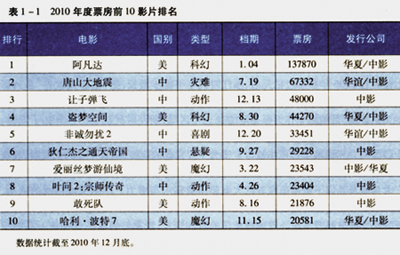 票房排名前10位的影片中,国产片和进口片各占半壁江山,平分秋色。前10位影片票房总和接近年内总票房的一半,反映出影片赢利能力极其不均衡的客观事实。2010年,进入排行榜前10位的影片,票房均达到了2亿元以上,比2009年度排行中第10位的影片《冰河时代3》(1.61亿元票房),排行门槛大大提高。