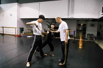 在位于国家奥林匹克体育中心的北京当代芭蕾舞团排练厅里,一位脚穿芭蕾鞋、戴着水袖的女演员踮起脚尖,蹲正身子在地板上缓重地往前挪动,以别样的舞蹈语言将“腰如蛇形脚如钻”的太极要诀诠释得惟妙惟肖。在她旁边静静观看并若有所思的是一位高大挺拔、身着宽松T恤的法国中年光头男子,他就是《中间》的编舞安东尼·艾吉亚。看完这段表演,安东尼·艾吉亚走到演员面前,竖起大拇指,又捧起她的手背吻了吻,以示肯定和鼓励。