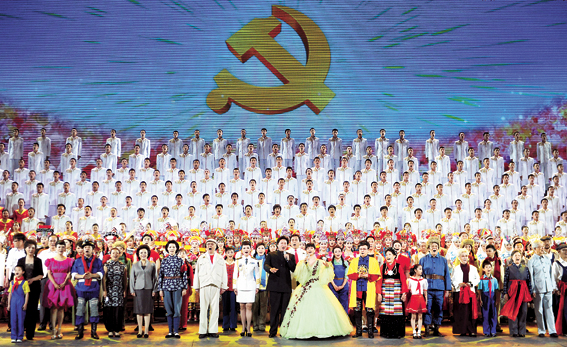 由中宣部、文化部、广电总局、解放军总政治部、北京市联合举办的庆祝中国共产党成立九十周年文艺晚会“我们的旗帜”,正在加紧排练,将于六月底在北京人民大会堂上演。文艺晚会的演员阵容强大,田华、陶玉玲、张勇手、贾作光、才旦卓玛、彭丽媛、宋祖英、殷秀梅、阎维文、刘斌、戴玉强、丁建华、濮存昕、张凯丽、谭晶、王宏伟、张也、黄豆豆等,老中青三代艺术家济济一堂,共同亮相。图为六月十八日,全体演员在排练歌曲《走向复兴》。
