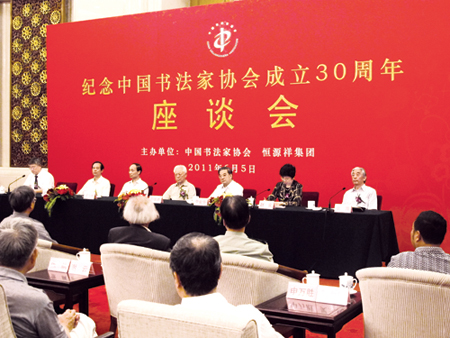 6月5日,由中国书协、恒源祥集团联合主办的纪念中国书协成立30周年座谈会在北京人民大会堂隆重举行。全国人大常委会副委员长周铁农,全国政协副主席李金华,中宣部副部长翟卫华,中国文联党组书记赵实,中国文联党组成员、副主席廖奔,中国书协主席张海,中国书协顾问刘艺、李铎、佟韦、张飙、邵秉仁、谢云,中国书协副主席王家新、苏士澍、申万胜、吴东民、吴善璋、何应辉、何奇耶徒、言恭达、张业法、张改琴、陈振濂、胡抗美、聂成文,中国书协分党组副书记、秘书长陈洪武,中国书协分党组成员、副秘书长戴志祺、潘文海,恒源祥集团董事长刘瑞旗,恒源祥香山画院院长陈明等,以及中国文联所属各文艺家协会、机关各部室及中国书协各部门负责人,在京的部分中国书协理事等出席会议。座谈会由中国书协分党组书记、驻会副主席赵长青主持。