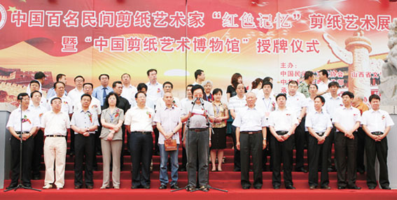 6月22日,由中国民协、山西省文化厅、大同市委宣传部主办,广灵县政府、中国民协剪纸艺术委员会承办的纪念中国共产党成立90周年中国百名民间剪纸艺术家“红色记忆”剪纸艺术展开幕式暨中国剪纸博物馆授牌仪式在山西广灵县举行。中国民协副主席乔晓光、曹保明,副秘书长吕军等有关方面领导出席开幕式和“红色记忆”剪纸艺术展研讨会。来自全国各地的剪纸艺术家剪出300余朵艺术之花,追寻党的光辉战斗历程,缅怀党的丰功伟绩。