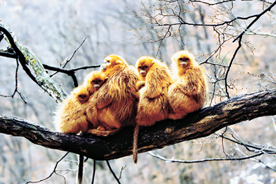 冷雨中一家 初春的秦岭,树木枯黄、食物稀少已经很长时间了,偏又冷雨霏霏,在粗大的树枝上又冷又饿的一家人只好紧紧相拥在一起,相互取暖,毛发已被雨水打湿,天还在落雨点。猴群好像都注意到了远处的我,连抱在母亲怀里的小猴都伸出头来张望,而大公猴却根本不愿动一动正在捂暖的身体,只是尽可能用眼睛斜着向这边观察着。川金丝猴,中国特有物种,国家一级重点保护、易危、CITES附录一所列物种。 陈建伟 摄