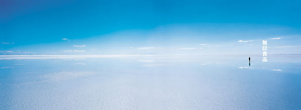 原研哉为无印良品设计的这张海报一望无垠,只有渺小的人、地平线和“无印良品”4个字。地球、人类……一切尽在不言中,无印良品所蕴涵的品牌精神一目了然。这张海报是用相机拍出来的:原研哉及其团队走遍世界各地,在南美洲玻利维亚的乌尤尼盐湖找到这心仪的地平线。无怪乎,原研哉的设计所经之处,崭新的地平线总会被发现并拓展。