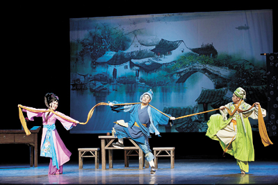 启示之二,摈弃削足适履。古老的戏曲艺术跨入当代之后,为了重新找回久违的繁盛、跟上时代的脚步,无数的创作者用他们的真诚和不懈的追求进行着多种多样的尝试,采取了探索、造剧、话剧加唱、荒诞派手法等途径进行变革,然而结果不尽如人意。其中有一种创作倾向值得警惕,这就是话剧加唱。当代话剧加唱的创造兴起于20世纪80年代末,没有人怀疑这种创作的探索者的善良愿望和美好初衷,可随着剧目的增多和逐渐形成模式,人们发现这种创作是以抛弃戏曲艺术的本质精神为前提的,那种既不断流动又相对固定的舞台时空不见了,虚拟动作与重在抒发人物真情实感的戏曲表演荡然无存,切实地完成了削足适履。赖声川及该剧主创头脑清醒,虽然所做的是话剧与戏曲的“链接”,却不以毁损各自的本质特征为原则。剧中老陶出走桃花源的那场“行舟”就是最好的证明。4个水旗上下飞舞表示江水翻腾汹涌,老陶在水旗的陪伴下边唱边舞,既要显示行舟的状况又要抒发内心的情感,整场戏一气呵成,舞台上呈现出一幅美轮美奂的江上行舟的流动画卷。这便是戏曲虚拟表演的本质精神,即描景、抒情、写人浑然一体。既要描景状物、又要抒情写人,同时进行又同时完成,以至于无法分清哪些表演是状物、哪些表演是抒情,这是戏曲艺术对人类戏剧演出史所做出的最大贡献。可以说,抛弃了这个本质精神,无论是越剧还是京剧乃至整个戏曲都将不复存在。