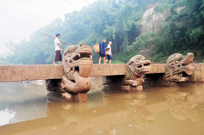 清晨的薄雾氤氲着墨绿色的九曲河,横跨其上的龙脑桥,麒麟、青狮、白象、盘龙一字排开,雄踞河面之上,昂首迎着水流。该桥始建于明洪武年间,全长54米,宽1.9米,建有十二墩十三孔,连同两边泊岸共十四墩,桥墩由4块条石垒成,最上面一块开凿凹槽,两块石梁板并排卡入凹槽为桥面,是一座典型的石墩石梁桥。