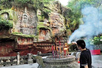 玉蟾山距离泸县县城只有1公里,距离现代社会却超过了500余年,明代的风韵一直在这里挥之不去。玉蟾山金鳌峰岩壁上,开凿有400余尊明代佛像,诸如九龙浴太子、千手观音、十八罗汉漂海图、养鸡女、六道轮回图等等。与安岳、大足石刻动辄数万尊佛像比起来,数目可谓寒酸,似乎是一个容易被忽视的角落,不过这并不影响它在四川乃至中国石窟史上的地位。