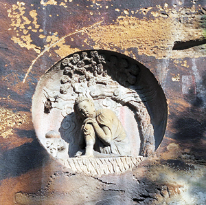 那些古印度的佛教经典,却在这里沦为了配角。千手观音下方,有一龛九龙浴太子图。佛教典籍记载,佛祖释迦牟尼是古印度净饭王长子,名悉达多,降生即能行走7步,步步生莲,一手指天、一手指地说“天上地下,唯我独尊”,时有9条神龙飞至悉达多头顶,口吐香水,为他洗浴。九龙浴太子图龛高约1米,一旁刻着悉达多在菩提伽耶树下冥思悟道的悟道图,直径也不过1米。