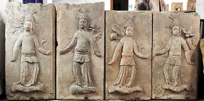 漫步在满是宋墓石刻的文物库房,4名宋代女子吸引了许多人的目光。她们头戴软脚花冠,披一件彩云形罩肩,长裙及地,跷尖鞋,手里拿着一朵莲花,跳着采莲队舞。《宋史》记载,宋朝宫廷有“女弟子队”153人,分为10个独立队舞,采莲队舞就是其中之一,舞者乘彩船、执莲花。采莲队对面的两个乐官,头戴软脚幞头,身着圆领袍衫,束腰束带,最特别的是他们的手,手臂微微张开,背着手,绾起袖子。据说,“两个乐官的姿势、神态确凿无疑地表明他们跳的就是失传已久的唐代六幺舞,而且他们是男的,原来六幺舞男子也能跳”。