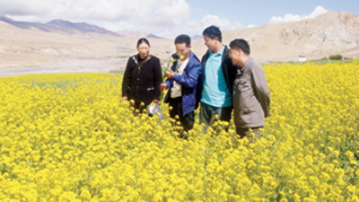 阿里地区农牧局技术人员调研科加村青稞、油菜长势情况 李卫宁 摄
