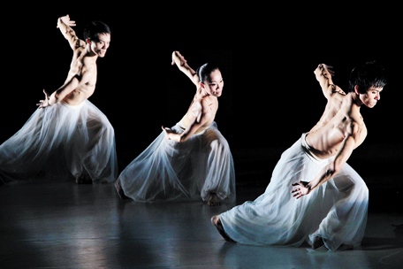7月23日,演员在表演现代舞《屋漏痕》。当晚,台湾现代舞团体“云门舞集”在台北户外专场演出《屋漏痕》。该剧以书法美学为基点创作,引导舞者以形体挥洒出如诗如画的意境,描绘浑然天成的泼墨山水美景。