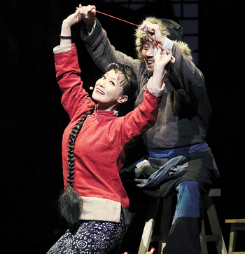 从剧场效果来看,观众对谭晶扮演的喜儿的歌声是满意的,包括艺术总监王昆。这位第一代喜儿的扮演者说谭晶的表演让她很吃惊,说现场演出几乎“吓了我一跳”,充分肯定了谭晶演出的时代感与角色的丰富性。当然,从建立所谓的“民族—通俗歌声”喜儿新形象的更高要求来看,谭晶的演唱潜质发挥并未尽善尽美,离老一辈喜儿扮演者演唱的韵味、吐字咬字的清晰,仍有一定距离;与纯通俗唱法歌声要求的细微表情也有一些距离。民族唱法和通俗唱法优点要统一到一个歌手身上,看来很不容易。这一点,谭晶去年在歌舞剧《在那遥远的地方》中的演唱表现也很明显。与同台纯通俗唱法的男主角相比较,她不缺声音的戏剧性,也不缺歌声的抒情性,缺的一点,恰好是通俗唱法声音表情的细节。新版《白毛女》喜儿的演唱,在民族与通俗唱法的结合上,谭晶有了一些进步。