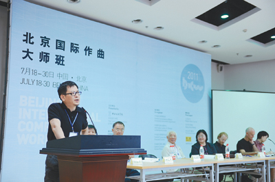 赵季平、郭文景、唐建平的小组课还未开讲,场内便已座无虚席。对音乐严谨的态度是中国音协主席、西安音乐学院院长赵季平最显著的特征,在小组课上,他态度温和、语调平缓、条理清晰,几乎完全忘记了赶路的疲惫和高温的困扰,手把手严格地点评和指导着学员;郭文景的小组课延续了他一向直率坦诚的风格,言辞一语中的且发人深省,学员展示过自己的作品后,他会迅速指出学员的不足并针对一些问题提出自己的修改建议;唐建平则给学员们展示了另一种教学风格,在学员展示曲目后他会不时说几句幽默的评论加以引导,他还亲自指点外国学员使用电脑系统,娴熟的操作让人大吃一惊。除授课教师之外,中央音乐学院作曲系几乎全系总动员,贾国平、郝维亚等老师自觉承担起了大师班的许多具体协调工作。