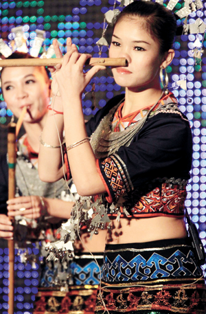 8月1日,参加2011中国(海南)七仙形象大使选拔的姑娘在表演民族歌舞(鼻箫)。当日,海南保亭黎族苗族自治县在台北举办“七仙形象大使”才艺展示选拔活动,推介海南的优良生态环境、热带雨林风光、健康休闲胜地及独特民族文化,推动海南与台湾人民的交流。