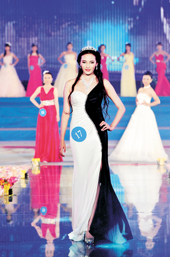 8月10日,西昌市火把广场,选手王紫璇在进行晚礼服展示。王紫璇最终获得“月亮女儿”冠军。当日,四川西昌第六届“月亮女儿”选拔大赛决赛在“月亮之城”西昌市火把广场举行,20名选手参加角逐。