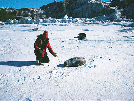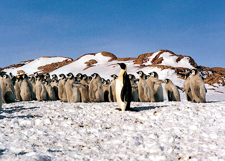 到南极不能不提企鹅。有一部影片《帝企鹅日记》讲述企鹅生存和繁衍的故事。与人类相似的一点,帝企鹅也会开办“幼儿园”,将小企鹅放到一起喂养。帝企鹅个头大,需要较长的生长期。生育时,企鹅妈妈会把蛋生在企鹅爸爸的脚上,生到冰上会被冻坏。从这时起,企鹅爸爸要把蛋抱在怀里,不能吃不能动三个月时间,而企鹅妈妈则回到大海寻找食物,等到小企鹅出生的日子立即返回企鹅爸爸身边,将找到的食物喂给小企鹅。小企鹅要拼命吃,拼命长,否则回不去就会冻死。这个时候,帝企鹅幼儿园就成立了,把小企鹅送到幼儿园,企鹅爸爸和企鹅妈妈就可以两个一起出去给小企鹅觅食。父母的爱果真是相通的。企鹅见到人们会很有礼貌地点头哈腰,表示问好,人们给它们拍照时,还会摆出各种姿势,像电影明星一样。