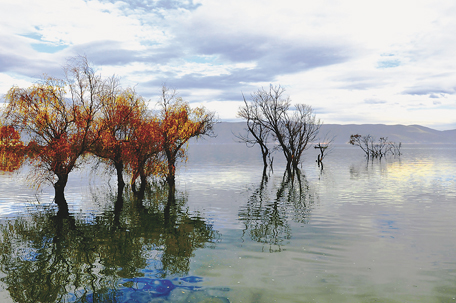 秋日,到大理一个村庄调研污水处理,村子紧邻洱海,没想到村后的景色竟然这么美。拍这个片子想体现一种自然静谧的美。蓝天白云,湖面静静的,似有薄薄的淡雾,看来水很浅,湖岸不远处的湖里长着一丛丛的小树,且树叶已成黄色,真是一幅天水一色图。