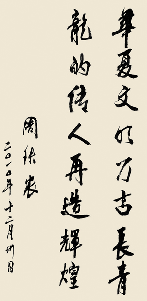 巨画分为六个部分,即,龙腾东方:表现中华文明的孕育萌发阶段;名播四海:表现中华文明在世界的传播及其巨大影响;风雨兼程:表现中华文明的交流融洽过程;磨难前行:表现中华民族在前进中受到的挫折磨难;迷雾探索:表现中华民族对近代衰落的反思和探索;腾飞辉煌:表现当代中华民族走上复兴之路。我们经历过外强凌辱的苦难岁月,经历过艰苦创业的努力奋斗,也经历和见证了改革开放的巨大成功,一幅画能承载着这么丰富的历史和现实,的确是一个很有意义的成果。当代的年轻人无论从事什么工作,只要能自觉把自己融汇到民族复兴的大业之中,把个人的命运紧紧和民族的荣辱成败联系起来,就会焕发出超强的力量和智慧。在邴锋创作的《中华魂》大功告成之际,特表示我的祝贺,并希望有更多更好表现中华文明优良传统的作品问世。