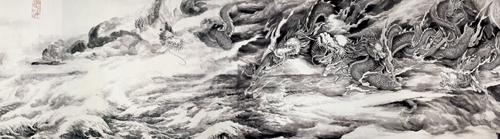 这幅画大气磅礴、墨韵生动、笔触苍劲,让我震撼。邴锋的画路较宽,人物山水均有佳作,尤其喜欢画龙。龙是中华民族的图腾,是中华文明的标志,邴锋在龙画创作中突出体现中华文明波澜壮阔的发展历史,为中华民族走上复兴之路击鼓高歌。