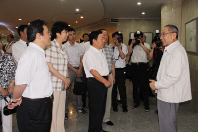 展览的主人,原中共中央政治局常委、原国务院副总理李岚清,白衣灰裤黑皮鞋,他一来到展览现场,就受到观众的热烈欢迎。