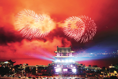 2010年中秋节,长沙橘子洲举行盛大音乐焰火晚会。整场音乐焰火晚会燃放高空礼花达47000多发,古典诗词画外音贯穿燃放全过程,并配以国粹京剧等具有强烈中国风的音乐。 新华社记者 龙弘涛 摄