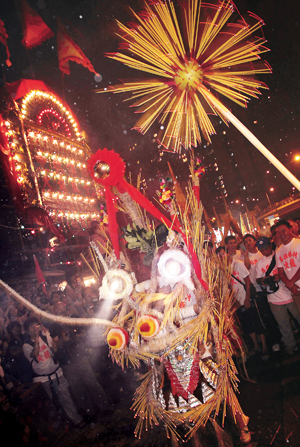2010年中秋,香港薄扶林地区举行舞火龙表演。舞火龙是香港中秋节最富传统特色的习俗,80米长的火龙龙身插满了长寿香,在龙鼓音乐配合下欢腾起舞。 新华社记者 吕小炜 摄