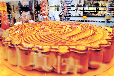 2011年9月6日,两位市民在沈阳一商场参观巨型月饼。这个巨型月饼直径100厘米,正面印有“龙凤呈祥”的图案,将在中秋节当天供市民免费品尝。 新华社发 张文魁 摄
